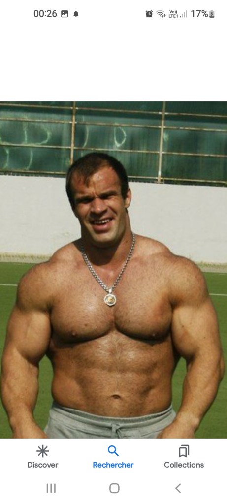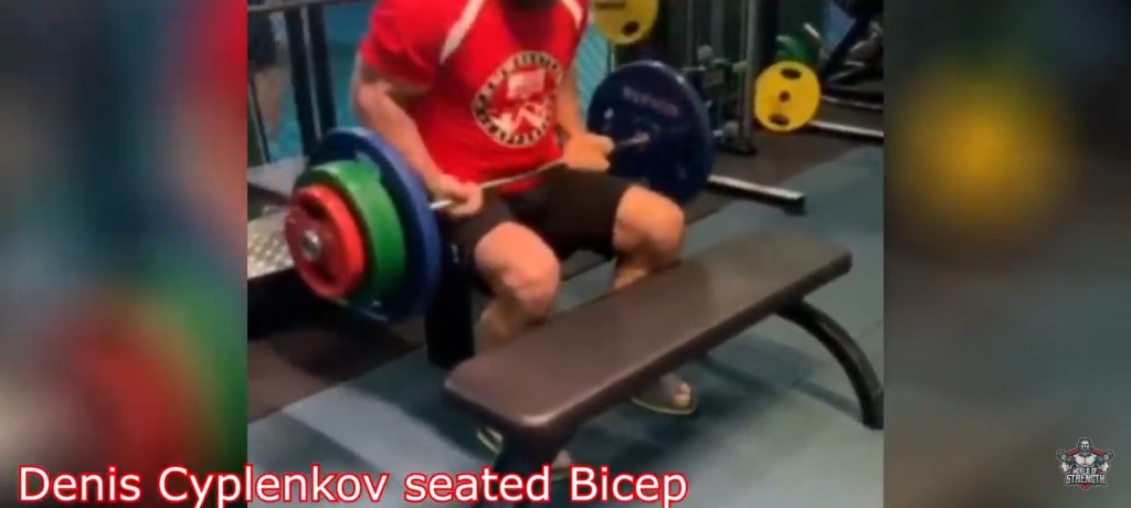 Denis, âgé de 40 ans, compétiteur au bras de fer. C’ est vraiment quelqu’ un d’ impressionnant, tout chez lui est hors-norme. Son avant-bras mesurant près de 48 cm et des biceps mesurant incroyablement 63 cm, plus de deux fois que la normale, qui est d’ environ 33 cm . Un poignet mesurant 20 cm et des doigts géants et épais. Des pattes d’ éléphants. Le résultat de son sport additionel qu’ est la lutte. Une excellente agrippe au niveau des mains. Sa technique d’ entraînement est remarquable car travaillant de préférence ses biceps avec la barre d’ haltères le plus souvent assis afin de muscler exclusivement la partie supérieure du corps qui joue en autre un rôle important dans le bras de fer et usant par conséquent lors des compétions du balancement vers l’ arrière afin d’ épuiser et déséquilibrer son adversaire. Alors que cet exercice, normalement s’ effectue principalement debout lors de l’ entraînement. Pesant près de 150 kg, un vrai bœuf avec des longs bras robustes de gorille. Son entraînement est plus basé exclusivement sur un apport de masse musculaire et des compléments alimentaires. (voir vidéo sur les compléments alimentaires ). Il n’ hésite pas à porter volontairement et spontanément lors des entraînements des charges exagérément lourdes comme Ronnie Coleman. Dépassant le plus souvent ses limites. Venons maintenant au tour d’ Andrey Pushkar, le frère jumeau, son frère homonyme dupont avec un t.